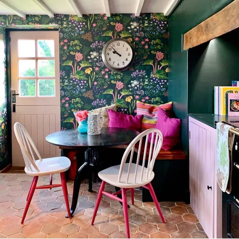 Ножки покрасили краской цвета шалфея, чтобы они оттеняли рисунок обоев.