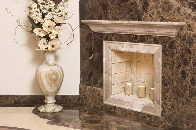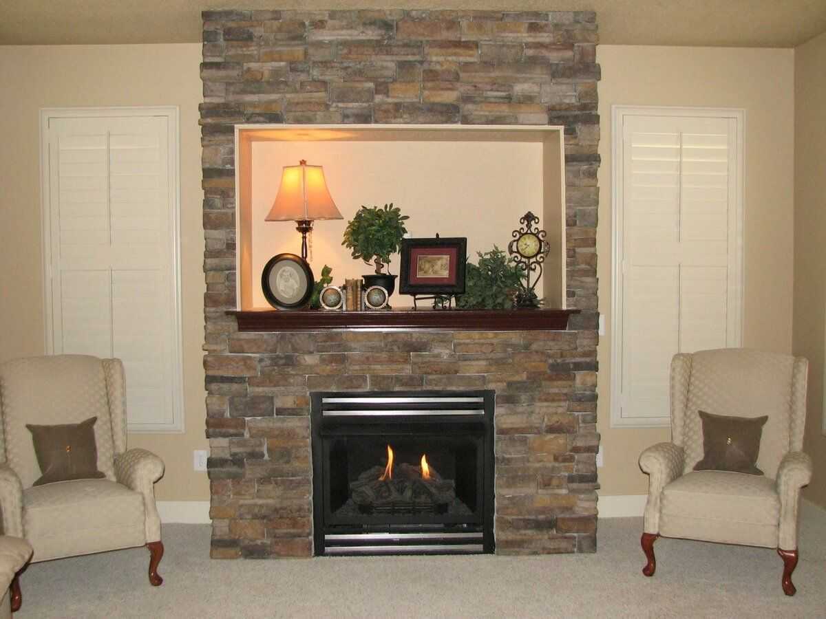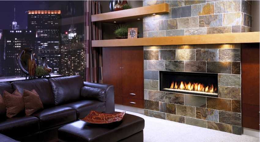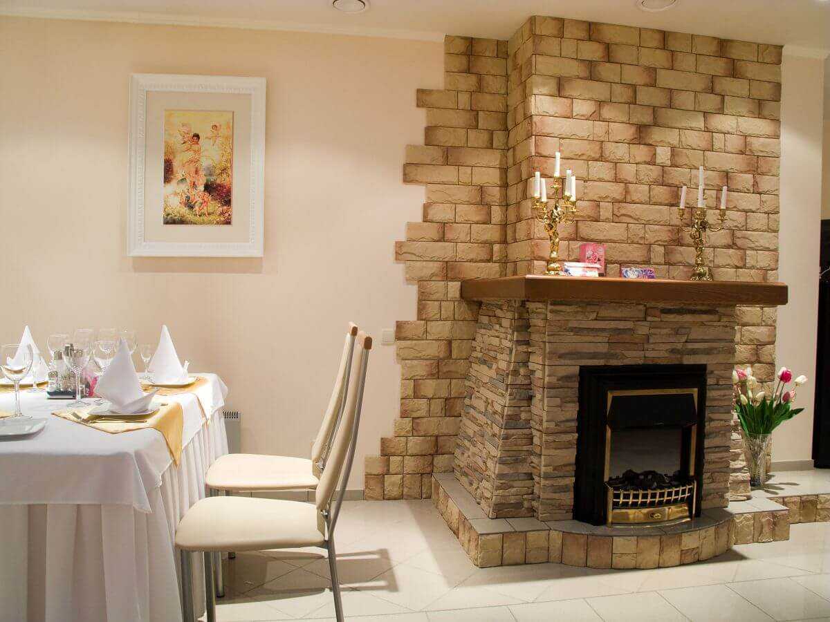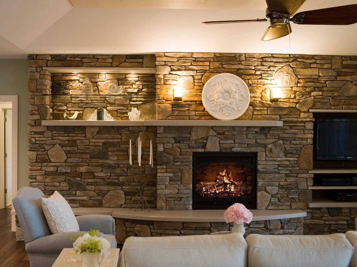 Каменная кладка или кварцевый агломерат, самым наилучшим образом подойдет для декора камина. С их помощью можно частично, полностью украсить стену с очагом или выложить только портал.