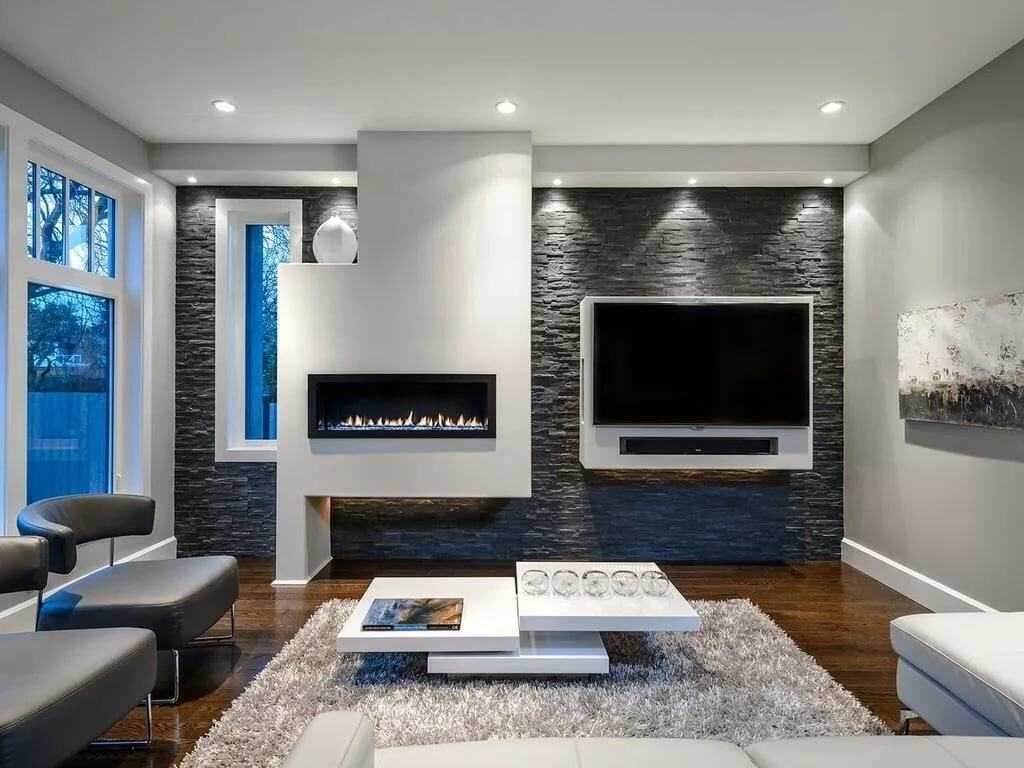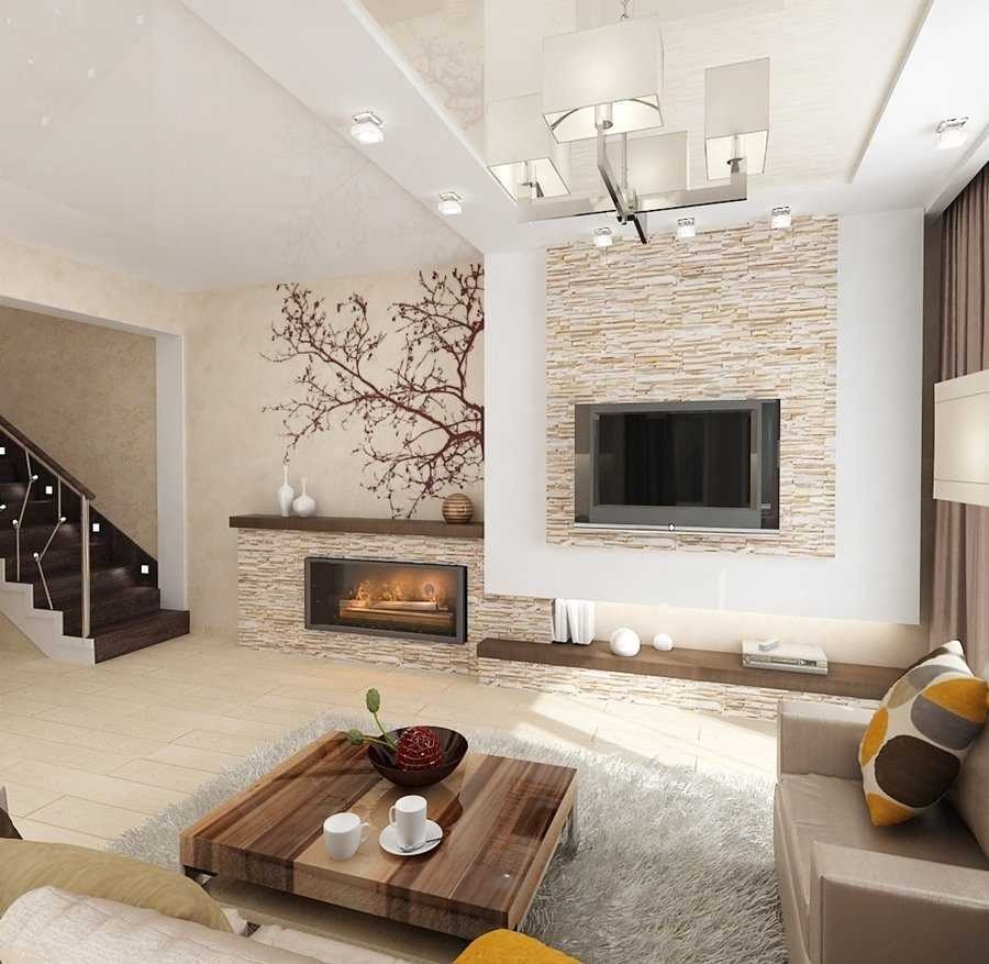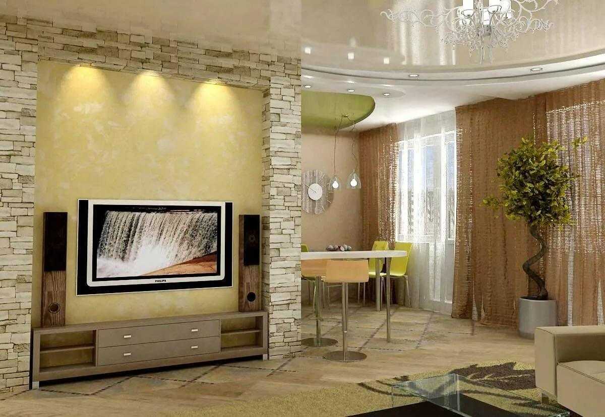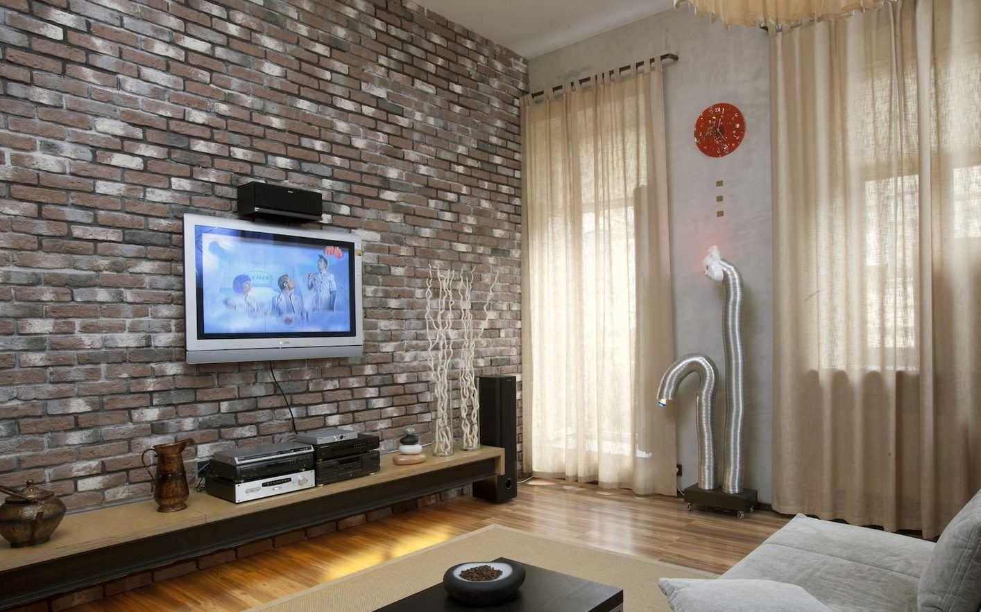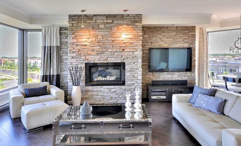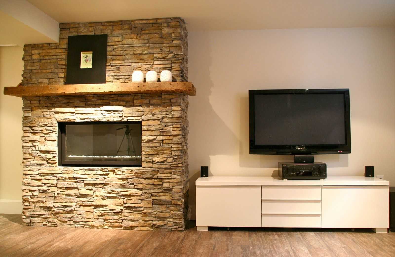 - отличным фоном для большого телевизора в гостиной станет декорирование части стены. Если в комнате есть камин, то и его можно облицевать таким материалом. Это беспроигрышный вариант, несущий мощнейшую стилистическую нагрузку;
