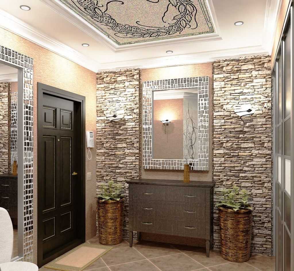 Прихожая с декоративным камнем смотрится роскошно. Им здесь украшают одну стену или обрамляют декорированную нишу. Оформляют выступающие углы и дверные проёмы, создавая зрительную ширину. Чаще выкладывают только нижние части стен, покрывая верх краской.