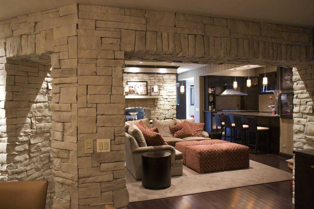 Интересно смотрятся на камнях живые вьющиеся растения или фотопечать плющей и лиан. В гостиной с каменной отделкой ставят кожаный диван, на пол кладут длинноворсовый ковёр, а окна драпируют мягкими шторами. Для декора двери-арки из прихожей тоже используют подобное оформление.