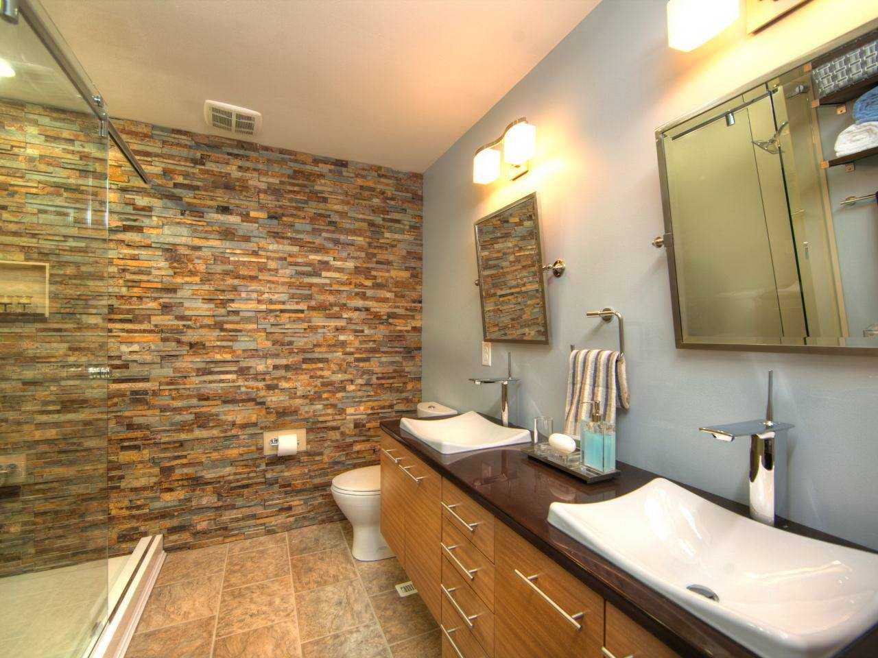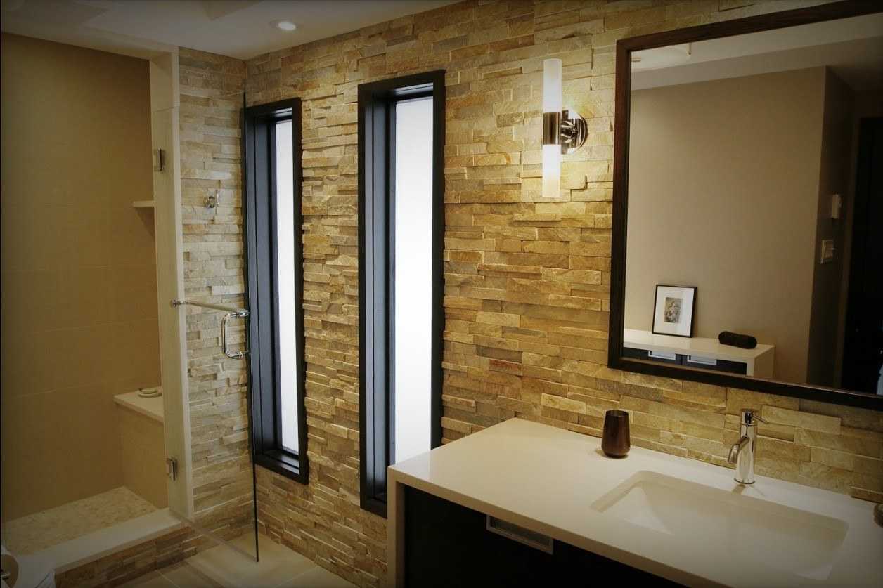 К декоративному камню подбирают металлические дверные ручки, обрамление зеркал и стиль полок. Загадочности и солидности отделке даст специальная светодиодная подсветка, которую устанавливают вверху и внизу покрытия. Для насыщенных камней выбирают светлый цвет стен.