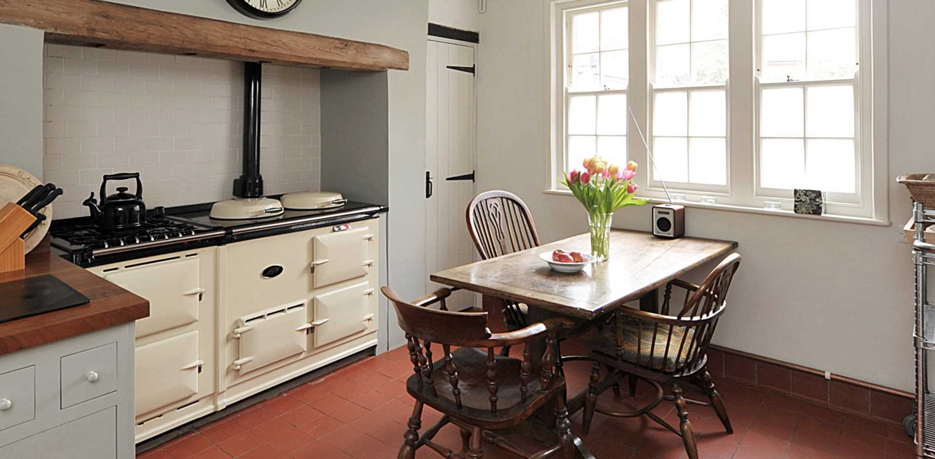 Каменный кухонный фартук будет хорошо гармонировать с деревянным полом