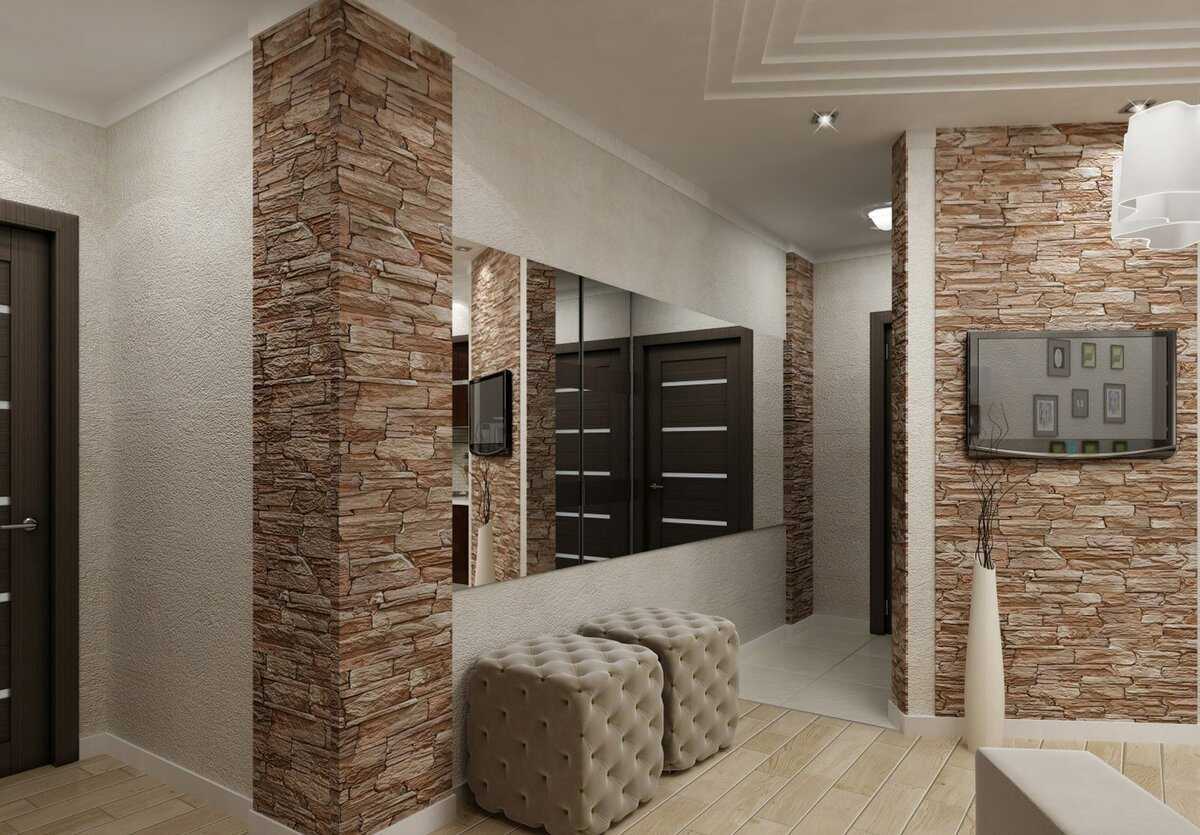На фото интерьер коридора с дверными проемами, оформленными декоративным камнем.
