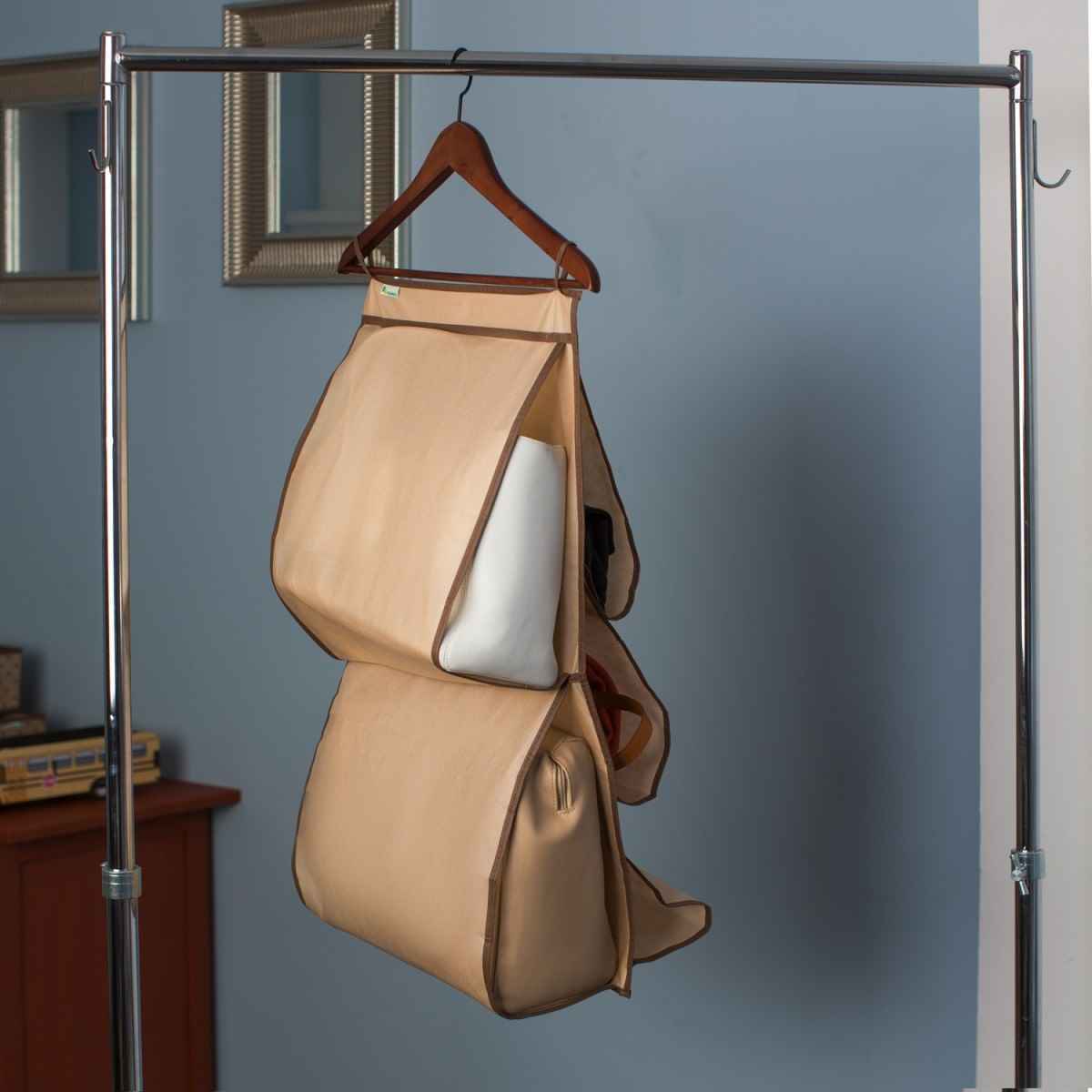 - Органайзер, который поможет экономить место – система хранения для сумок. Это замечательный подвесной органайзер, где вы сможете расположить по вертикали любимые аксессуары на удобных мягких полках. Сумки будут храниться в одном месте и под рукой. Подвесить органайзер можно как в шкаф, так и на крючок в гардеробной. Карманы органайзера будут защищать изделия от пыли.