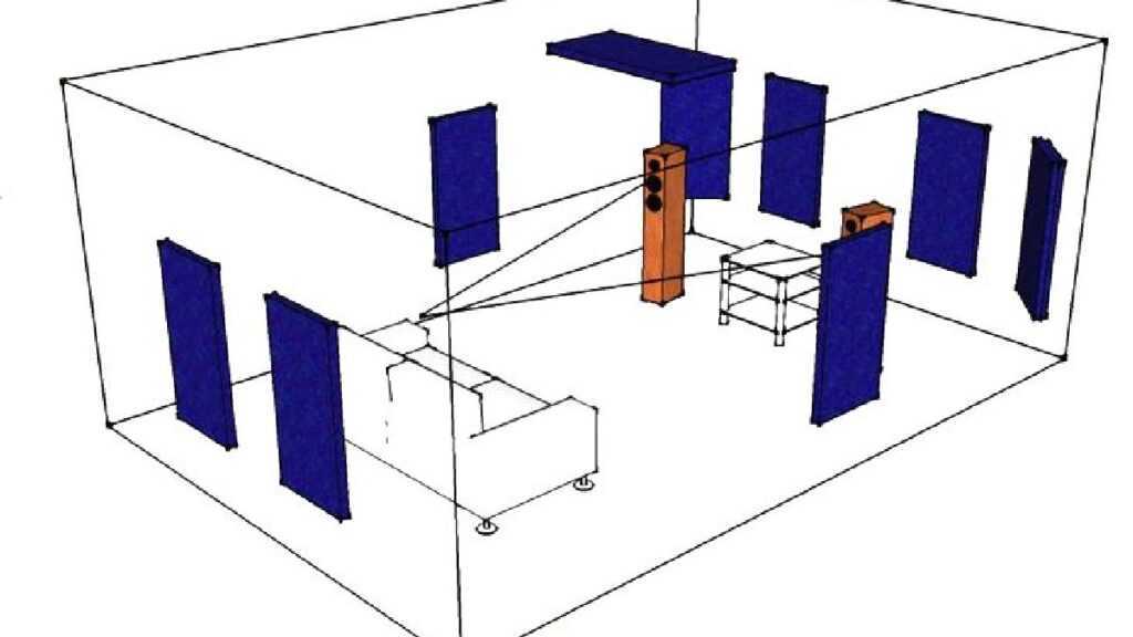 - . Эффективное средство – ковер с высоким ворсом на полу. Так же и стены требуют размещения на них звукопоглощающих панелей. Найти в комнате место для панелей просто – слушатель сидит в своём “специально установленном” кресле, а кто-то водит зеркалом вдоль “нужной” стены и слушатель ловит визуальное отражение колонки в нем. Вот это и будет местом для панели.