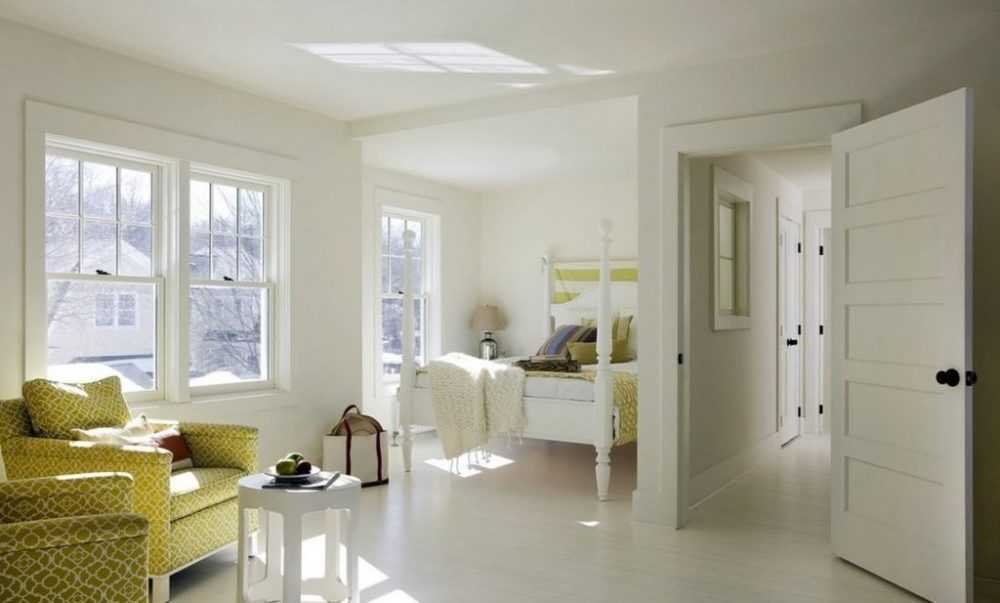 - Плинтусы и наличники одного цвета с контрастным оттенком полотна. Довольно необычно, но очень стильно смотрится белый плинтус на фоне любых оттенков в интерьере, если наличники также выкрасить белым.