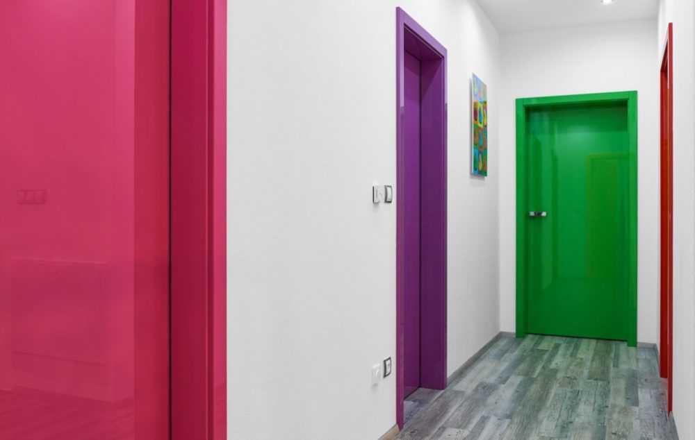 Любителям смелых сочетаний, у которых поверхность стен, полов, потолков выкрашена яркими цветами, можно порекомендовать чисто белую дверь. Она освежает интерьер, делает его стильным.