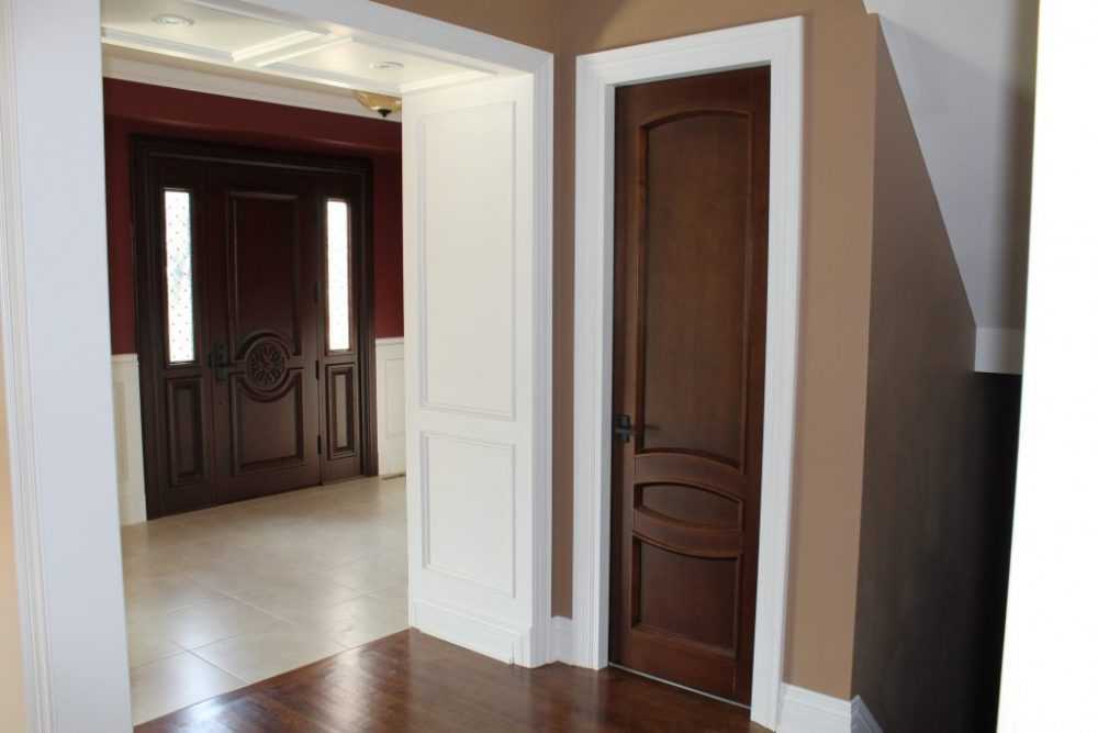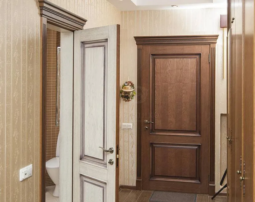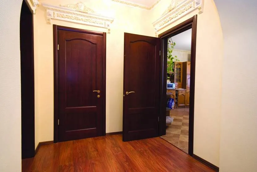 Если дверь разграничивает две комнаты, полы которых разного цвета, желательно выбрать прохладные оттенки натурального дерева — бук, орех, дуб. Точно такими же сделать наличники, плинтус.