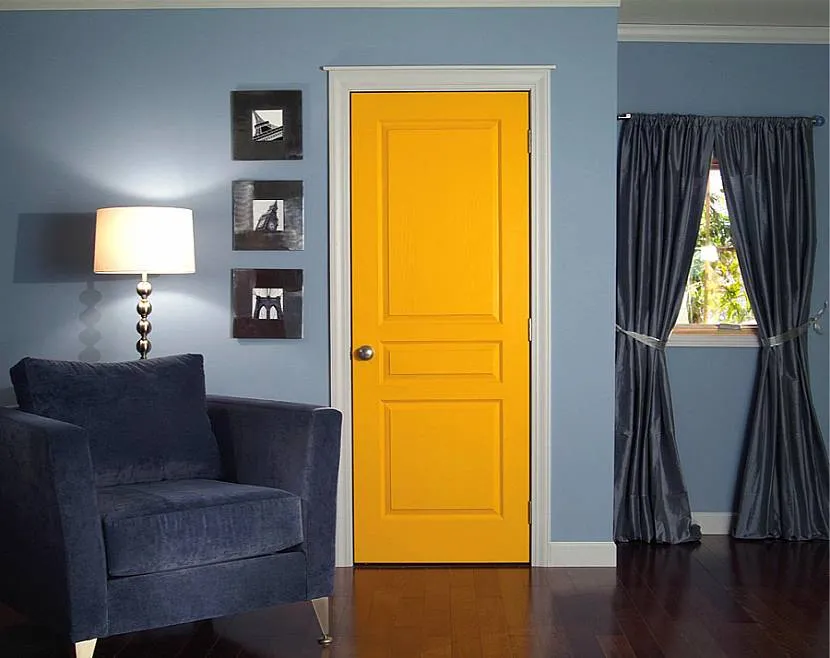 Нестандартным вариантом дизайнерского решения является добавление ярких акцентов в дверные блоки. Покрашенная в желтый, зеленый, оранжевый или красный цвет дверь выглядит достаточно стильно. При этом помните, что такая дверь должна сочетаться с каким-то элементом интерьера. Если окрасить плинтус под фон дверного полотна, то можно логически завершить данную композицию.
