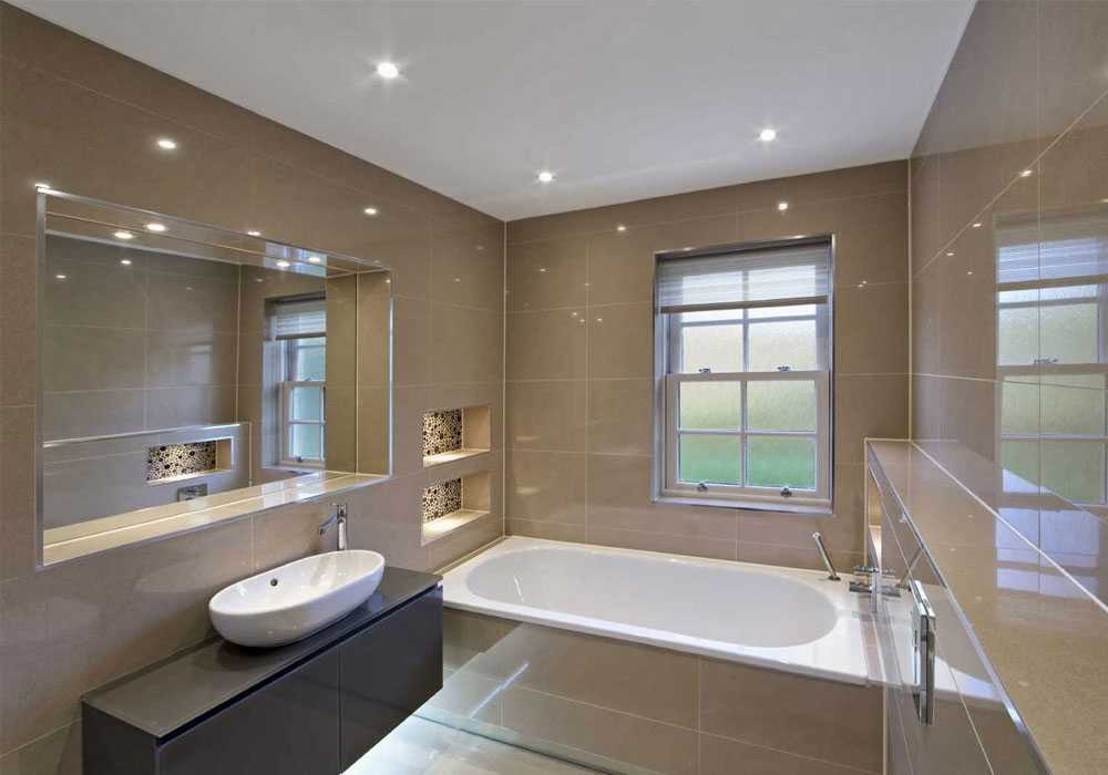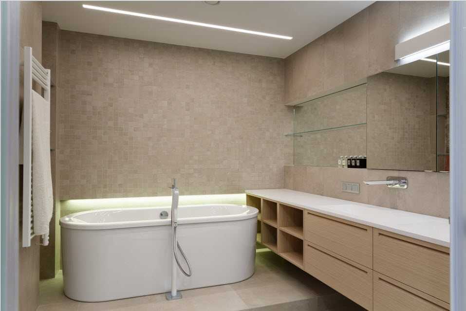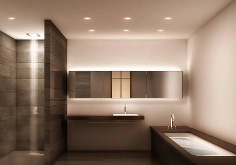 В большом помещении желательна установка нескольких приборов верхнего света. Чем больше количество светильников, тем меньшим размером и мощностью они должны отличаться. Для просторной ванной комнаты подойдет зональное освещение, благодаря которому получится добиться выделения отдельных функциональных участков, а также подчеркивания конфигурации пространства.