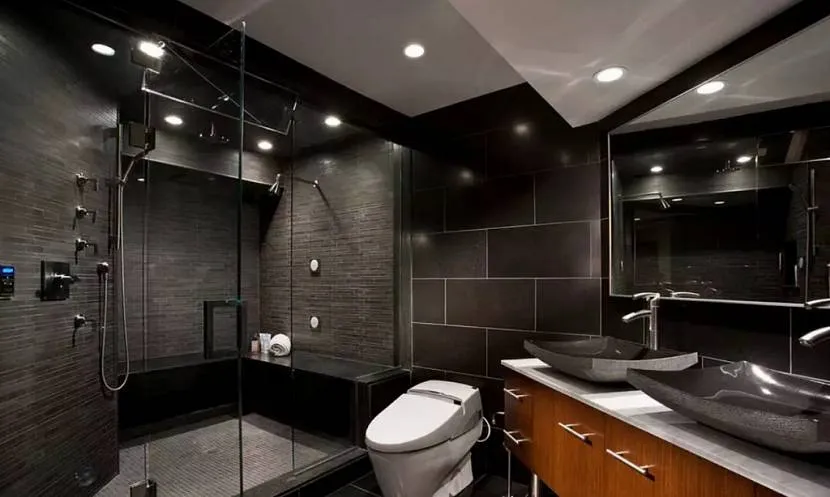 Темная отделка ванной требует большего освещения Источник loungemobel.com