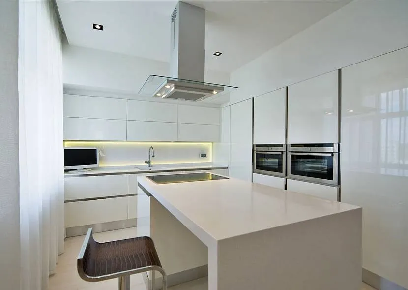 Минимализм. В современной кухне вместо классической плиты устанавливается варочная панель, барная стойка вместо стола и рольставни вместо занавесок в пол. Минималистичный интерьер может быть оформлен в монохромном дизайне или трех цветах: белом, бежевом и любом контрастном;