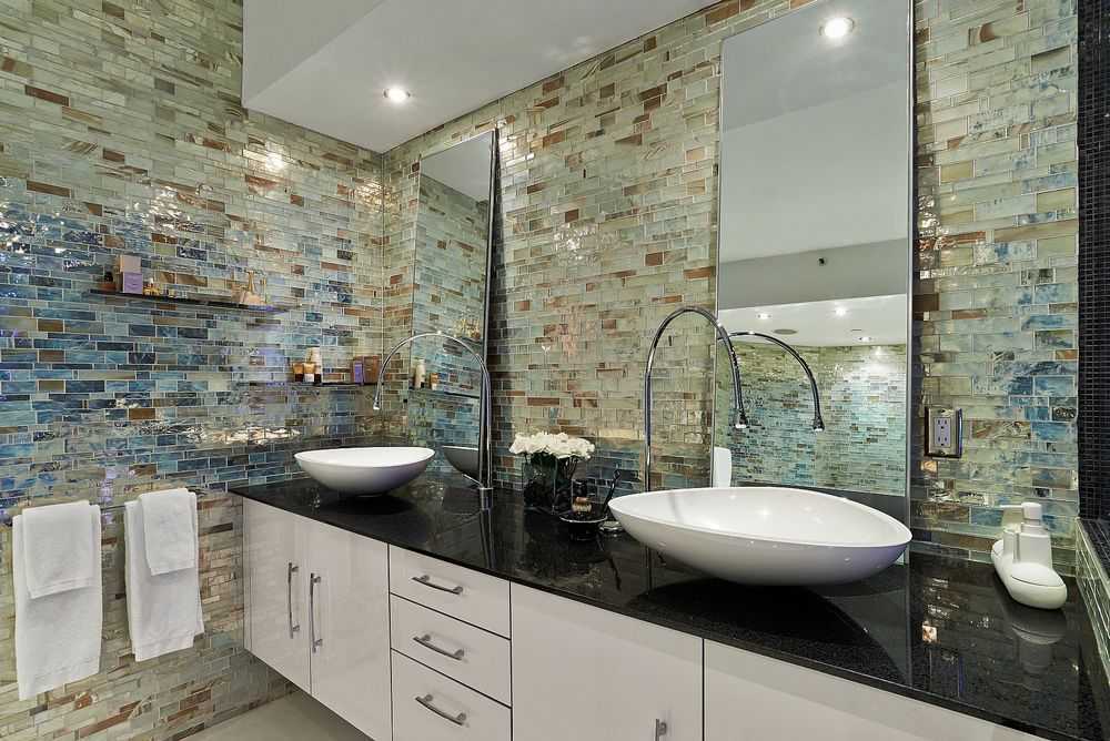 Наконец, стеклянная плитка очень красивая и станет потрясающим акцентом. Она достаточно скользкая, так что для пола не используется.