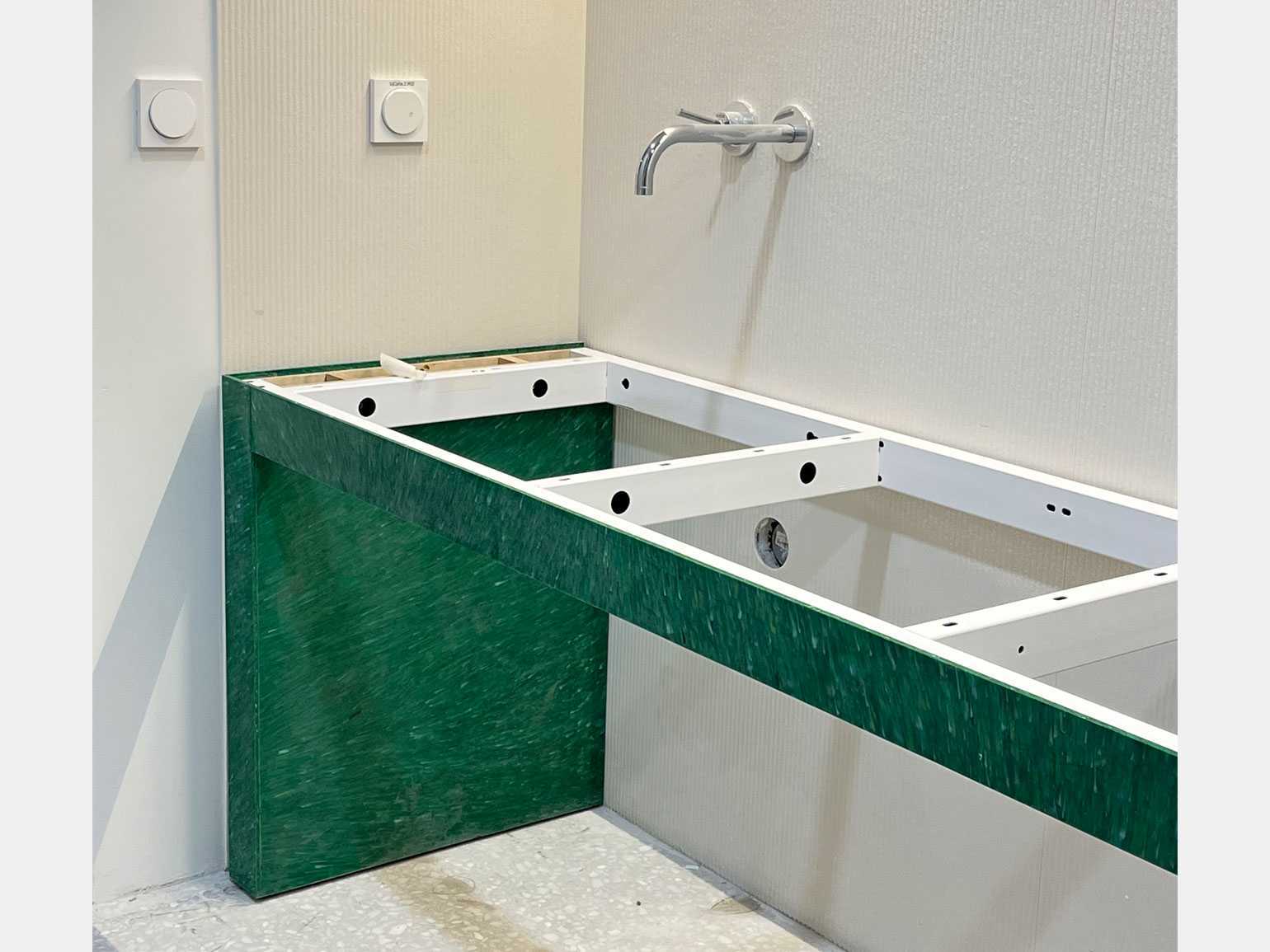 Для нас этот заказ стал интересной задачей. Для оформления санузлов дизайнеры выбрали большие тяжёлые раковины. Нам нужно было оформить кронштейны для них из переработанного пластика. Пришлось продумать много инженерных решений — разработать конструкцию, которая выдерживала бы большой вес, сделать систему креплений листов к каркасу.