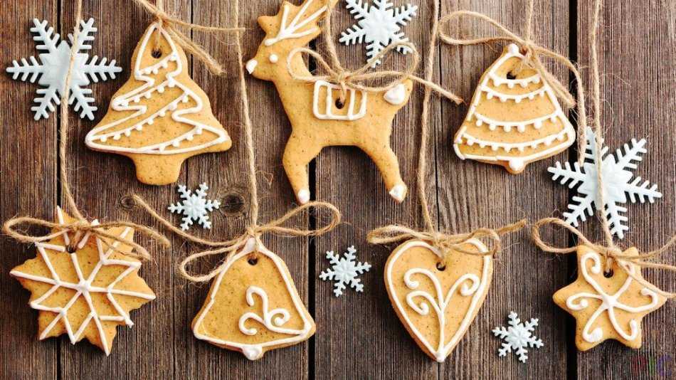 Не менее стильно смотрится съедобное оранжевое украшение из цитрусовых. Апельсины разных размеров можно обернуть в блестящие сеточки или фольгу. Достойным дополнением к фруктам станут фигурные печенья или пряники. Сладости украшают разноцветной помадкой, блестящими сахарными бусинками. Чтобы поддержать рождественскую тематику, кондитерские изделия выбирают в форме елочек, снеговиков, домиков.