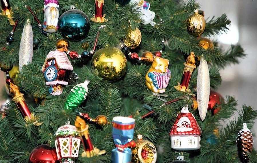 Вариант подходит для тех, у кого сохранилось много игрушек со времен Советского союза. Традиционными украшениями будут Снегурочка с Дедом Морозом, звездочки, малинки и грибочки, а также стеклянные бусы и свечи.