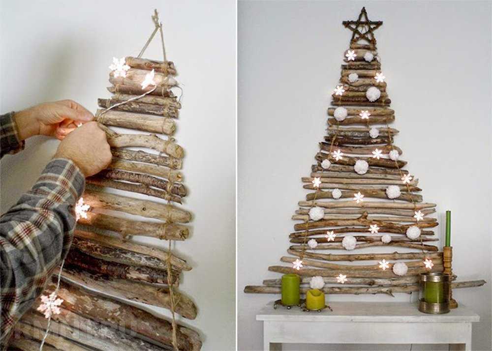 Оригинально смотрится праздничная елочка, сделанная своими руками из обычных палок. Это очень просто и интересно. Можно закрепить ее на стенку, необычно украсить разными игрушками из натуральных материалов – листочками, шишками, фруктовыми дольками, ягодами.