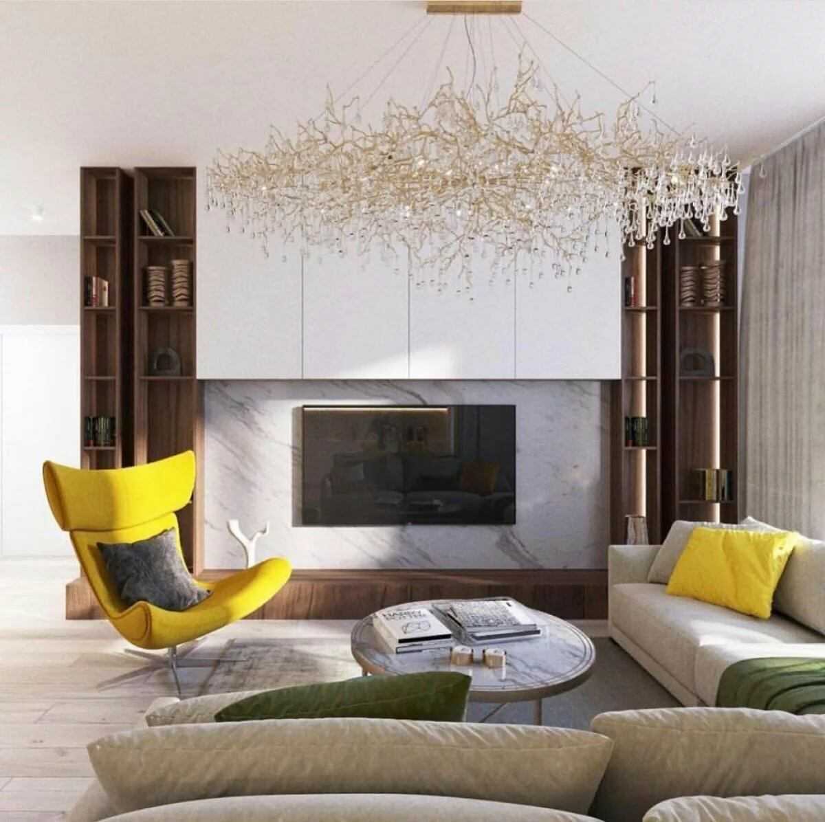 Успешно выбранная люстра, лампа для потолка – незаменимая мелочь в интерьере. Учитывая тенденции, светильники должны быть в стиле художественной инсталляции. Ниже приведем фото: