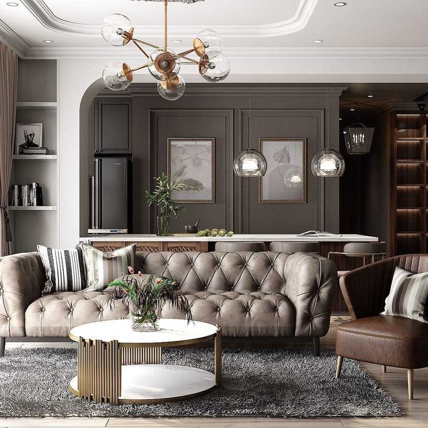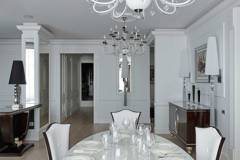 Интерьер в стиле неоклассика украшен изящной лепниной. Гармоничный дизайн подчеркивает правильно подобранное освещение.