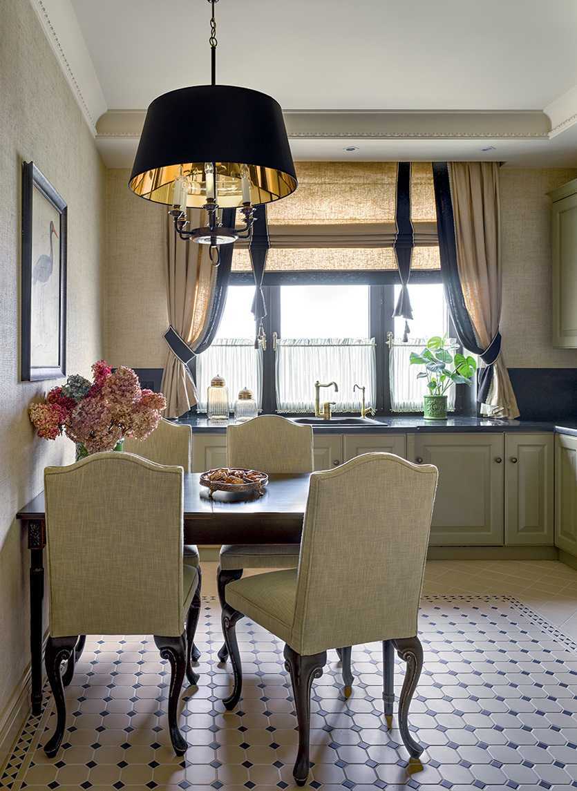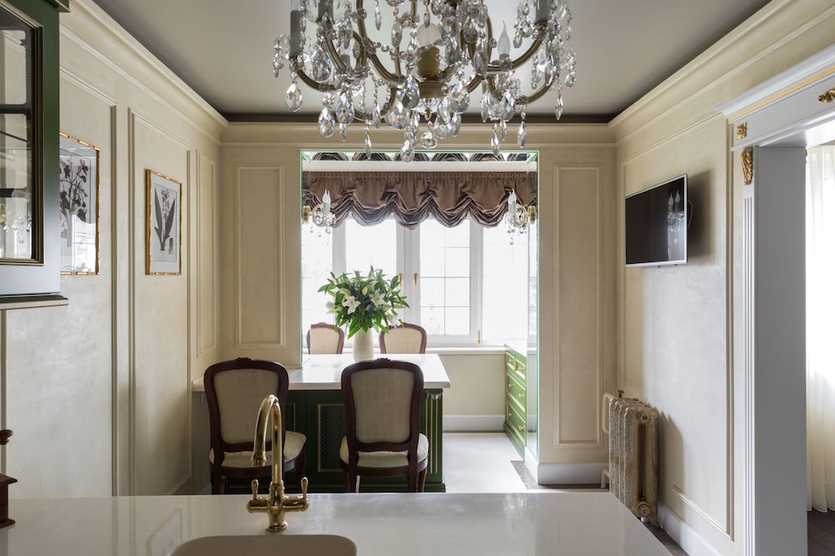 В столовой в неокласической стилистике присутствуют натуральные материалы в достаточном количестве. Для облицовки пола идеально применение мрамора или керамогранита. Рабочую зону оформляют керамикой или моющимися обоями. Для практичности выбирают стулья с обивкой из кожи. В маленькой кухне в хрущевке более уместно смотрится светлый гарнитур с остекленными фасадами.