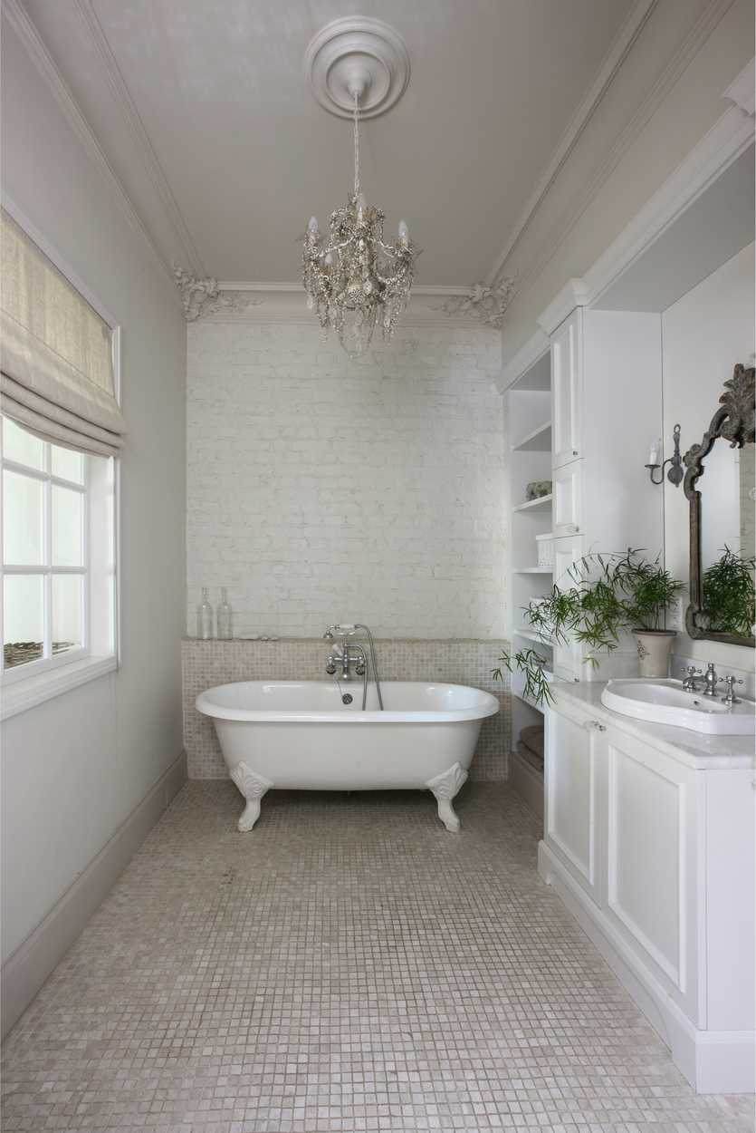 Хрустальная люстр а или светильник в ванной комнате – неотъемлемая часть неоклассического оформления