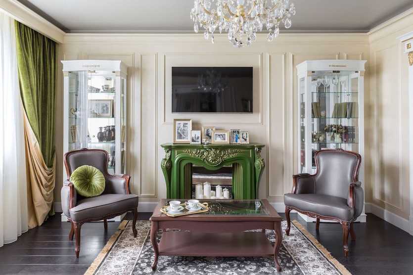Декоративный камин — привлекательный элемент неоклассической гостиной.
