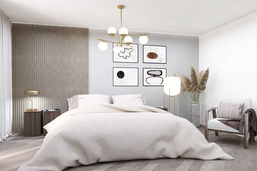 Современное направление не предполагает обилия декоративных вещиц. Достаточно будет нескольких стильных светильников, пары картин на стенах и красивого покрывала на кровати.