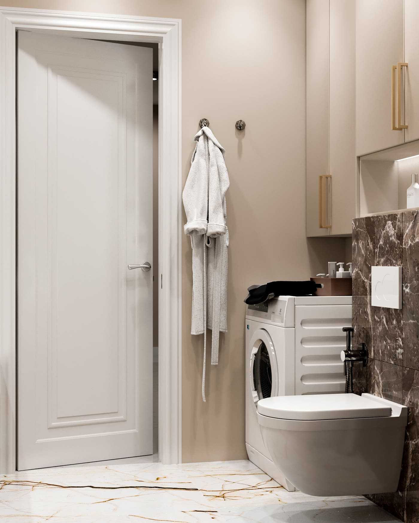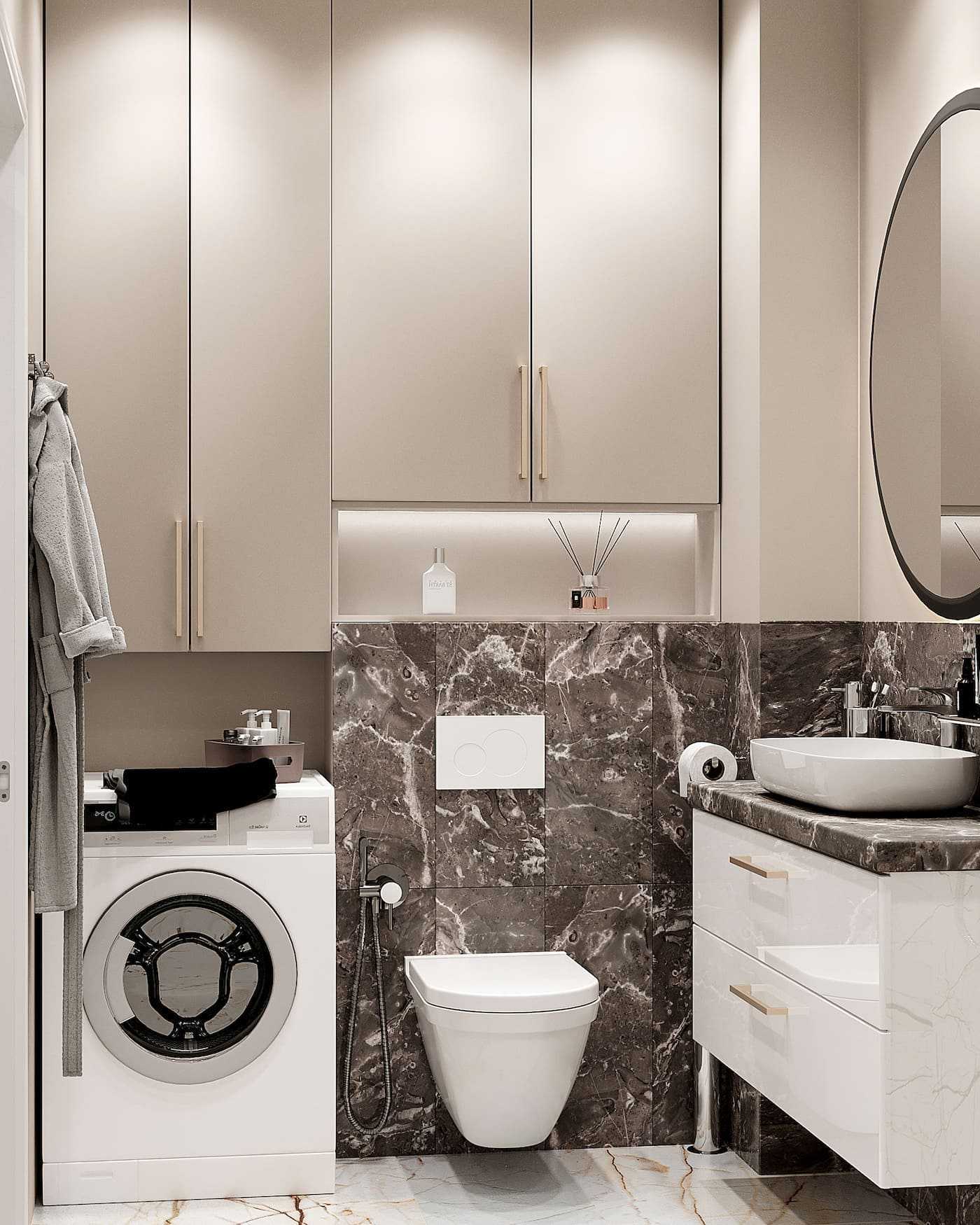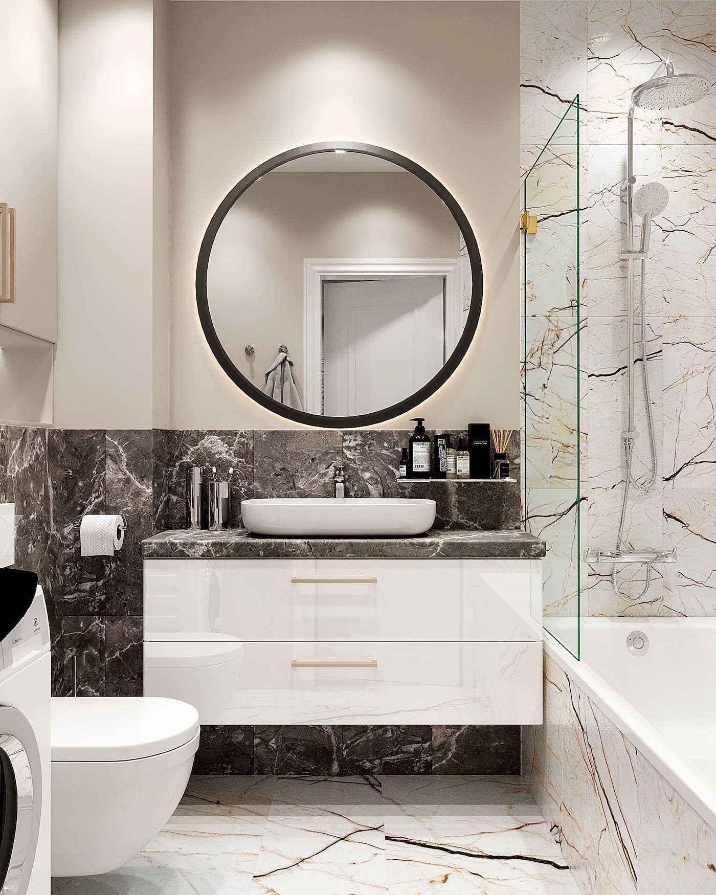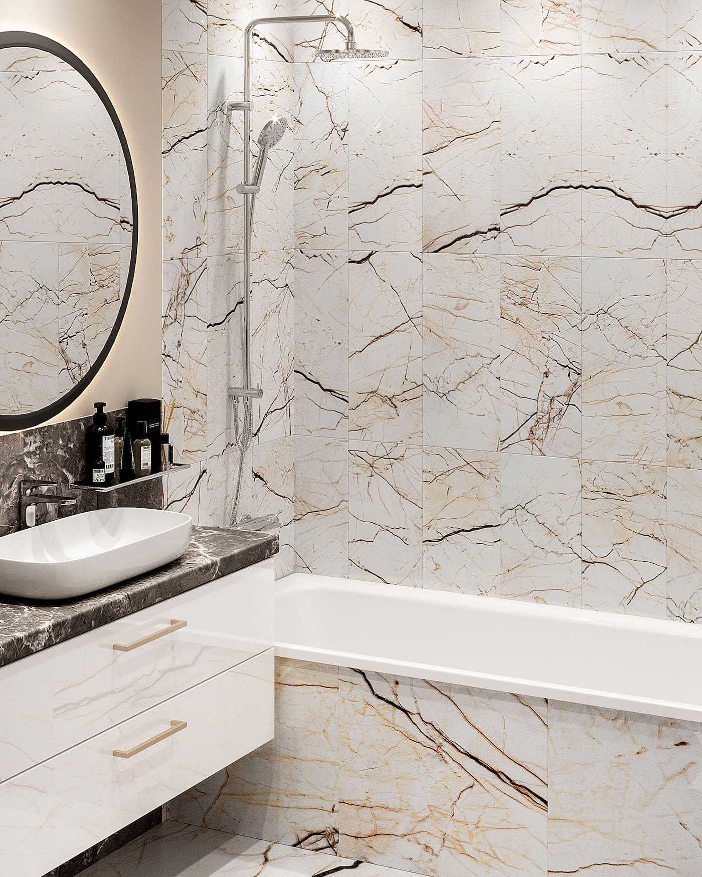 Потолок украшен авторским витражом, вторящим розовому акценту, а резной декор массивной зеркальной рамы составляет классический ансамбль с гипсовым карнизом и лепниной на потолке. Изюминка интерьера — акцентная стена из чёрного мрамора с золотистыми прожилками, отлично сочетающегося с солнечно-тёплым светом ониксовой «лавы».