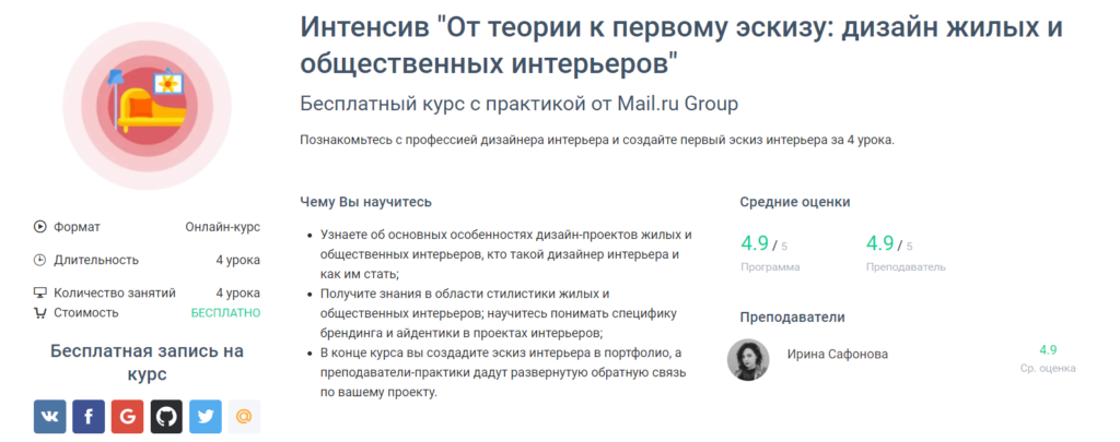 «От теории к первому эскизу: дизайн жилых и общественных интерьеров» от GeekBrains