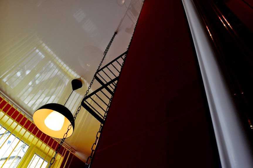 При входе на кухню правая стенка также облицована красным ламинатом.Установлены новые шторы
