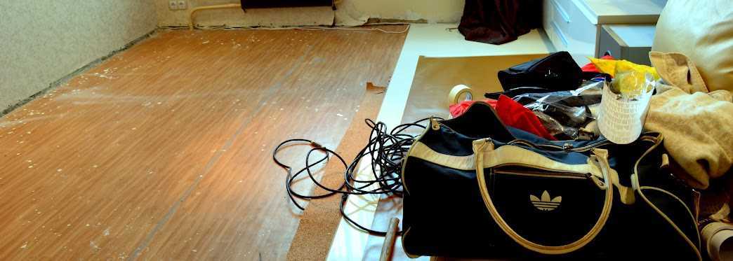 Сразу застилаю ламинат, кладется прямо на линолеум, подложка- пробка