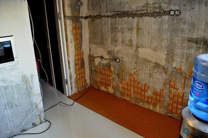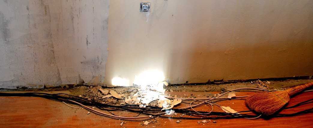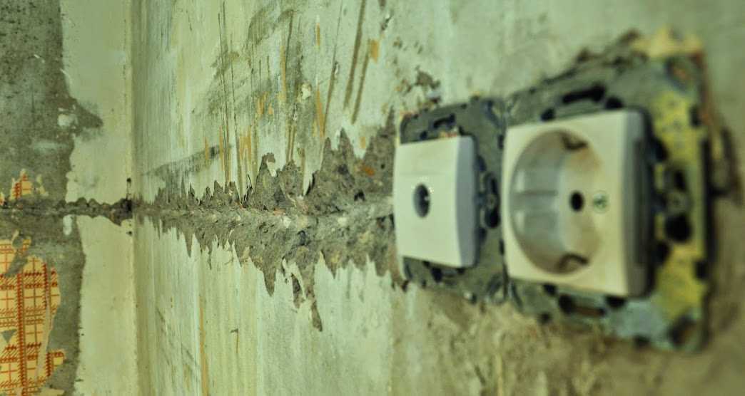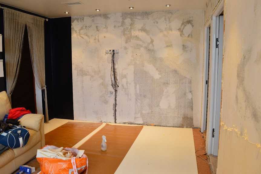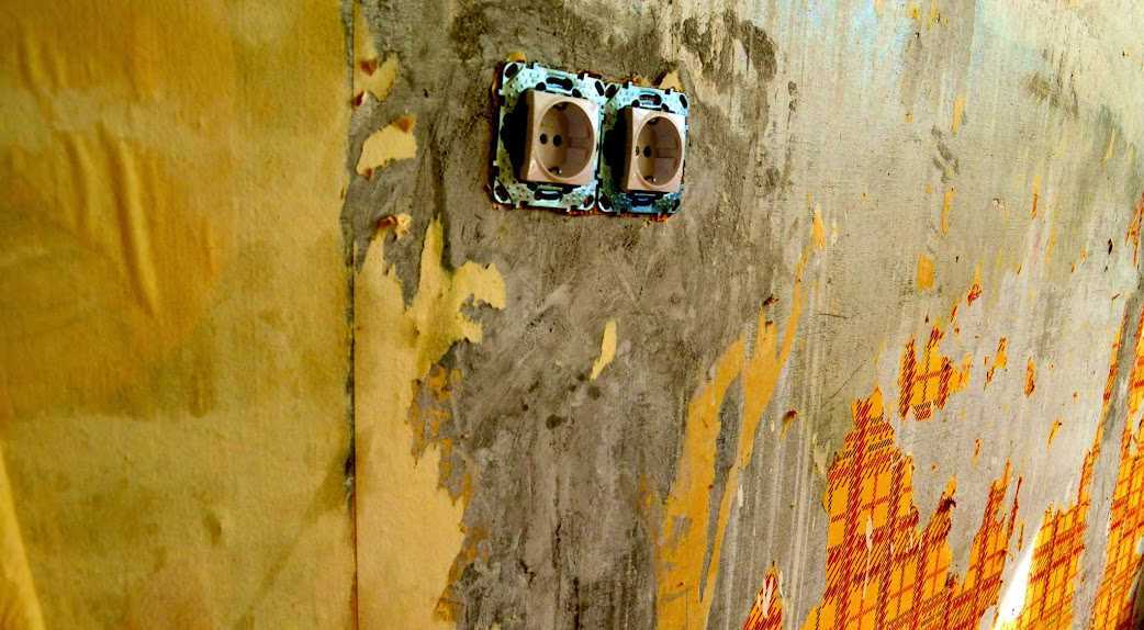 Предварительно делаю штробы для новых проводов, чтоб был фронт работы на ночь.Сразу запускаю кабеля, промазываю ротбандом, ночью промазываю стену шпаклевкой с целью частичного выравнивания.Поверхность слишком зернистая и требует сглаживания, иначе,учитывая полотно обоев все дефекты будут проглядываться
