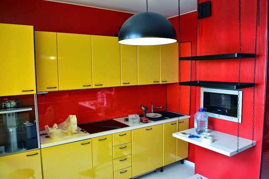 Результат на четвертый день. Обои поклеены, ламинат постелен. Много времени занял монтаж новой столешницыПодвесные полки на цепях также менялись вместе с цепями.Кухонный фартук — красный глянцевый ламинат. С ним запарился тоже, проще мозаику заклеить.