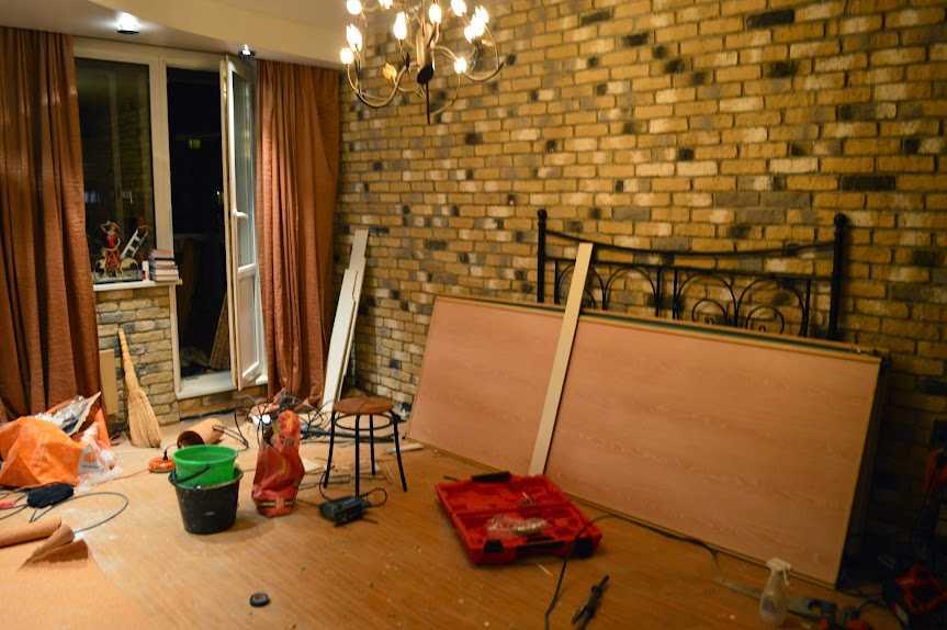 .Спальня.Первым делом выносим ковролин. Снимаю ткань со стены- на фото немного зацепил-на стене прямо, темно -бордового цвета. Вообще то клеили ее в прошлом году, но супруга не поняла приколу, в этот раз решено покрыть стену камнем.