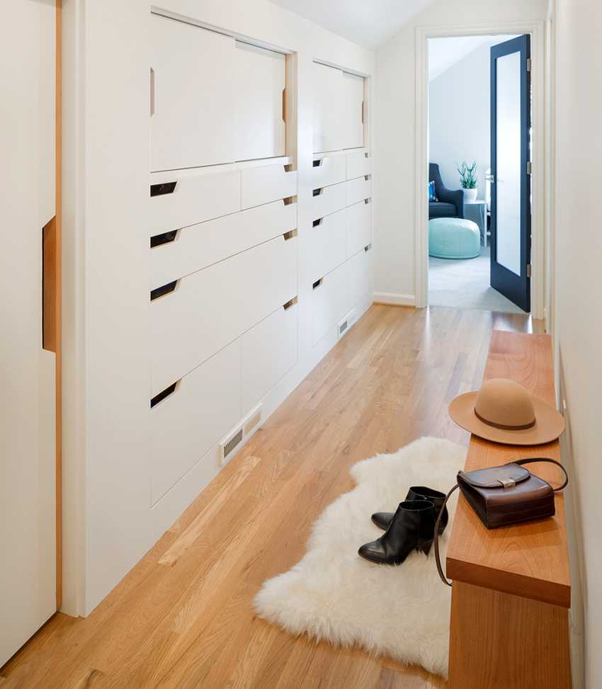 Узкие и длинные коридоры не могут уместить в себе большое количество модульной мебели, но в них отлично впишется встроенный шкаф. Также можно прорезать в стене такого коридора небольшое окно ведущие в соседнюю комнату и там организовать красивую вешалку для одежды.