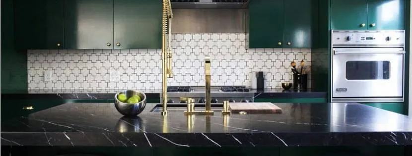 Альтернатива: если вас привлекает текстура горных пород, оформите стену над плитой и мойкой керамогранитом под мрамор, и лучше, если столешницы будут выполнены из него же — это сделает кухню визуально легче и просторней.