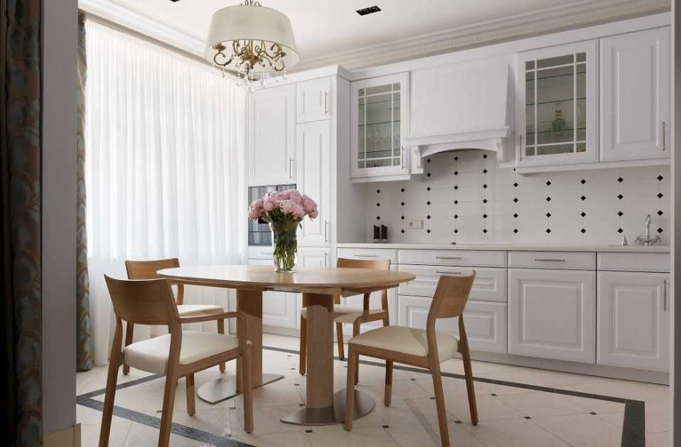 Фартук из керамической плитки белых оттенков подойдет к кухне пастельного или белого оттенка. Дополнить интерьер можно деревянной столешницей, стульями, обеденным столом.