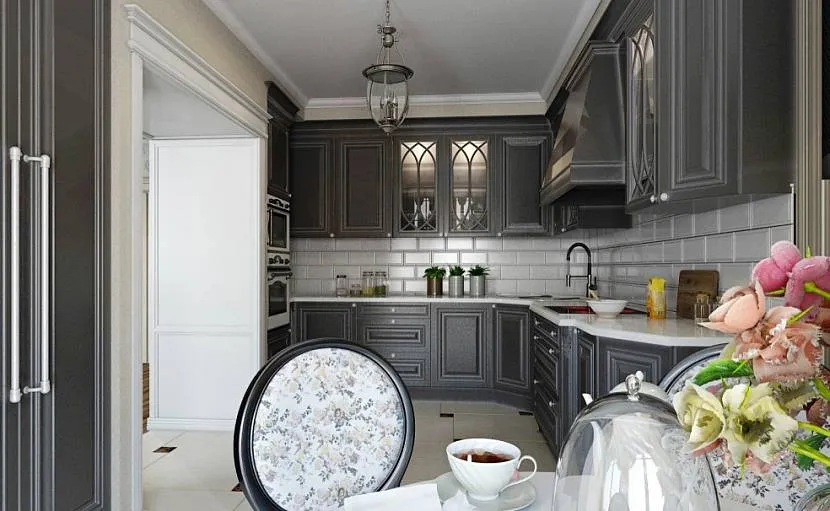 Универсальный вариант исполнения кухни в сером цвете с фартуком из белой плитки. Этот вариант нейтрален, освежить и добавить что-то новое можно яркими цветами, посудой, мебелью. При небольших затратах сил и средств можно легко изменить дизайн кухни.