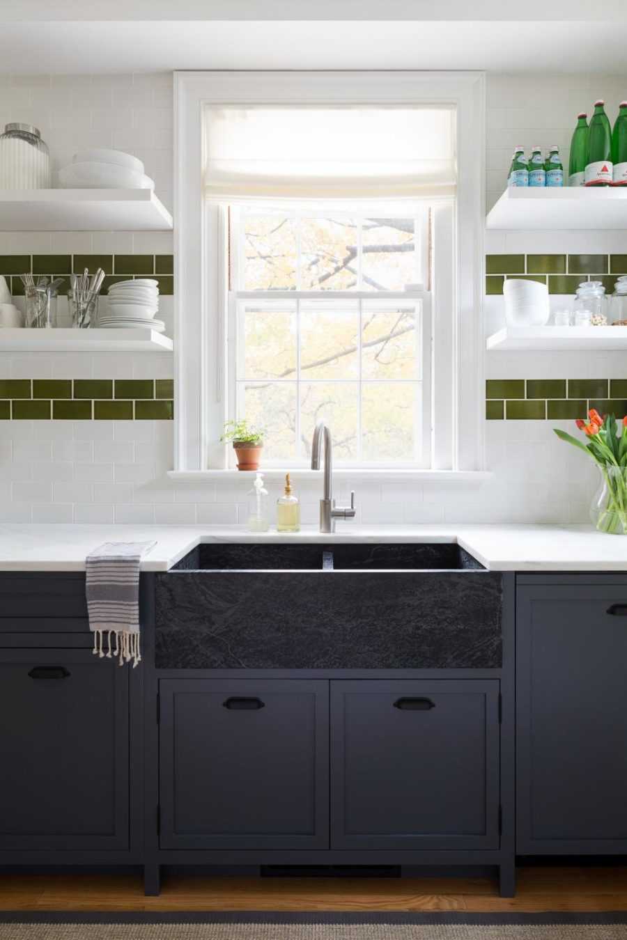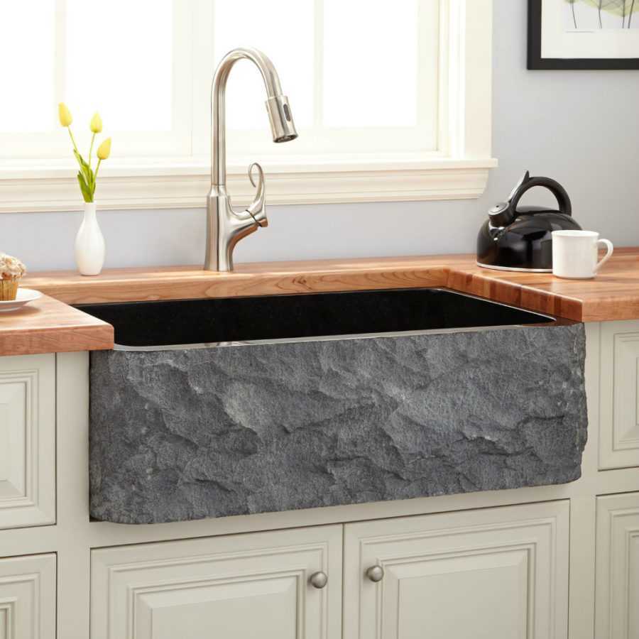Новинка в дизайне кухонь – двойная раковина фермерского типа, выполненная из камня. Она может выглядеть как современно, так и традиционно, в зависимости от интерьера.