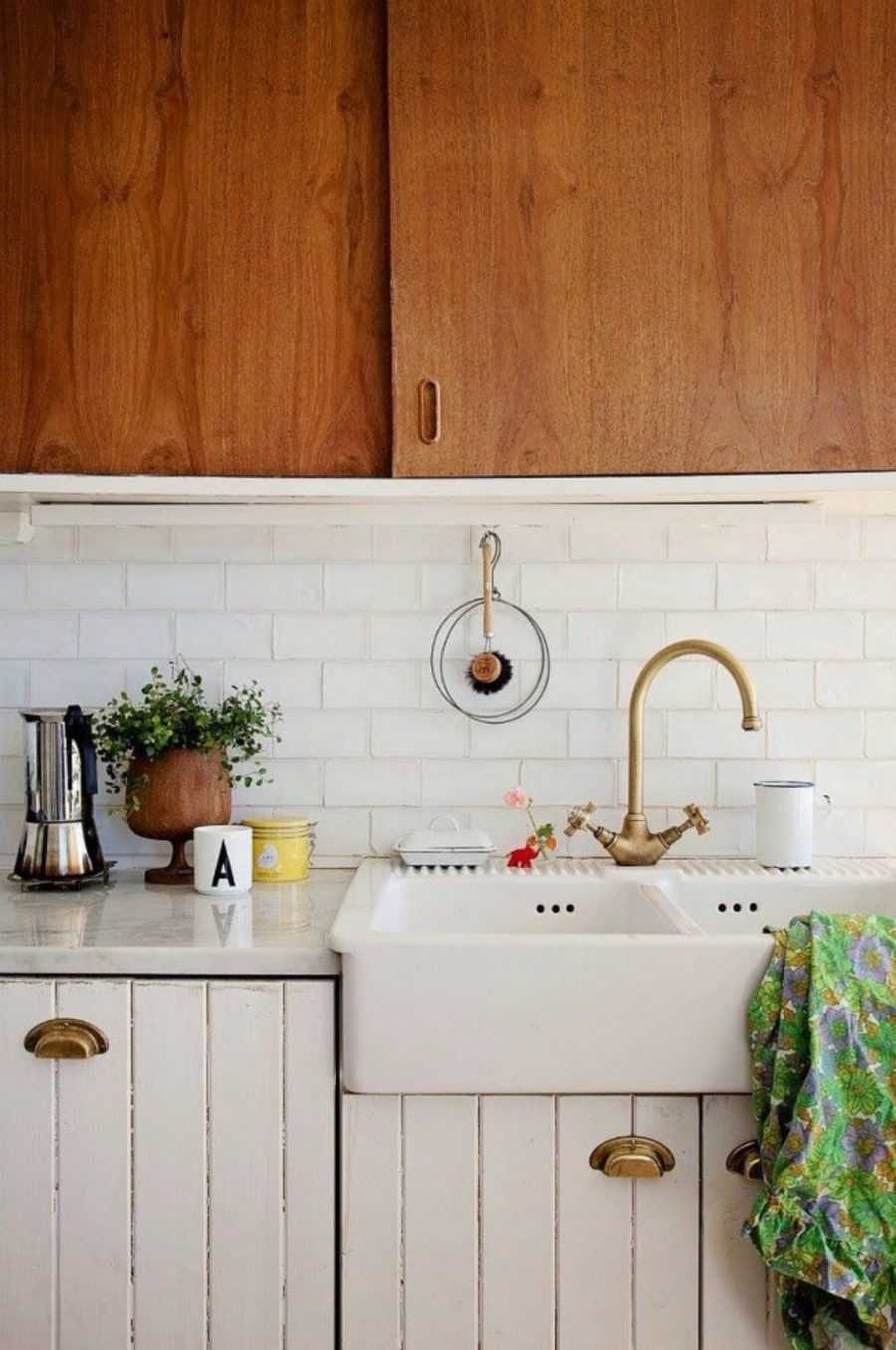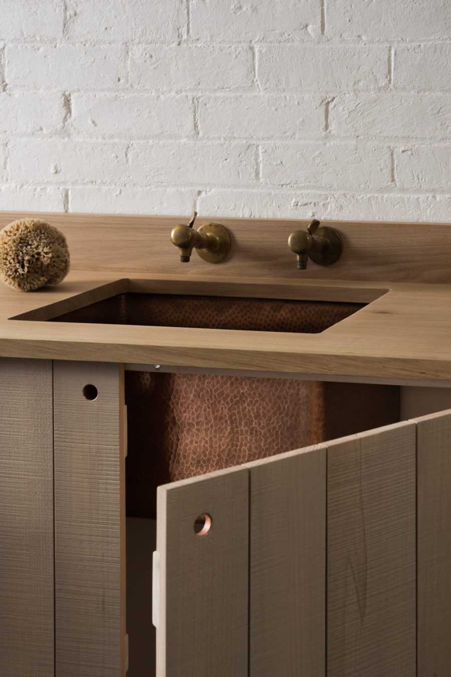 В представленном примере медь отлично сочетается с закалённой латунью на смесителе и необработанным деревом на кухонном пенале.