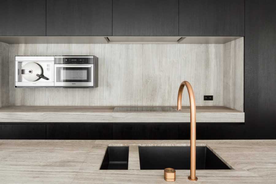 Компания Kapito Muller Interiors интересно обыграла черно-белый контраст, немного разбавив это сочетание латунными деталями. В результате получилась роскошная стильная кухня.