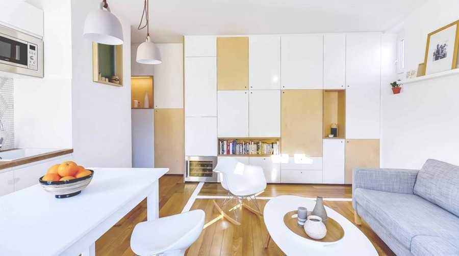 - Изучите современный рынок: сейчас появилось довольно много трансформирующихся или откидных вещей. Например, сердцевина тонкой перегородки превращается в столик, а кровать прячется внутри встроенного в стену шкафа;