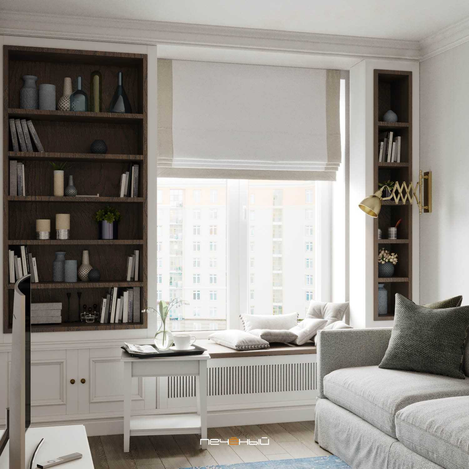 Прекрасно смотрятся в таком помещении римские шторы или жалюзи, но они могут перехватить на себя всё внимание, а значит, будут отвлекать взгляд от общей картины гостиной