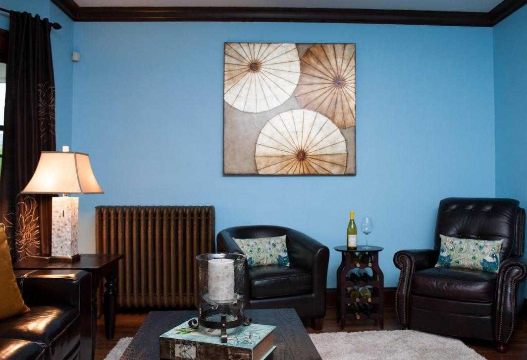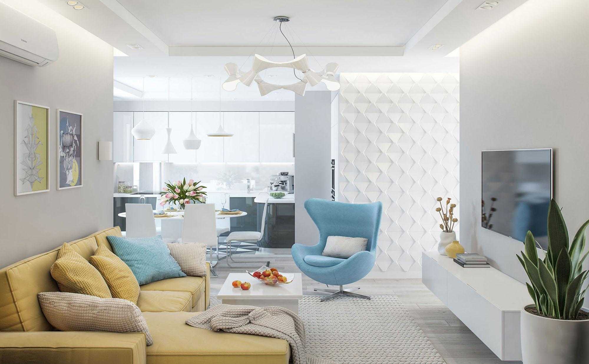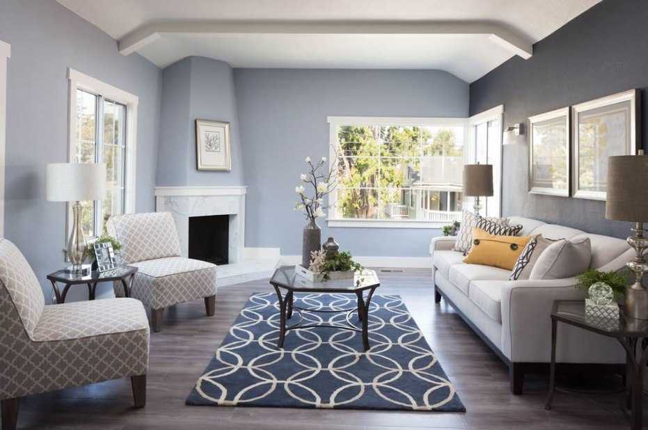 Несмотря на то, что стены синего цвета пользуются популярностью, многие предпочитают комбинировать с белым оттенком. За счет этого получается создать стильный контрастный интерьер, который точно не останется без внимания гостей. Кроме того, в процессе оформления можно использовать различные цветные акценты. Это позволяет немного экспериментировать даже при минимальном бюджете на дизайн гостиной.