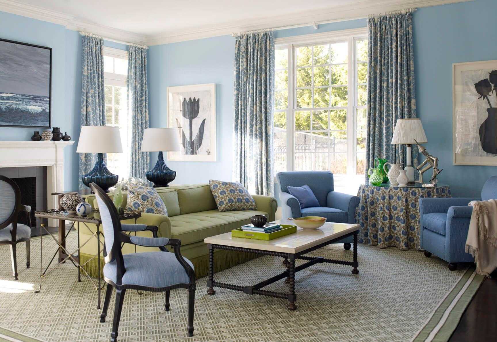 Если вы не готовы с ярко-синему оформлению гостиной, выбирайте мягкие голубые оттенки. Они хорошо смотрятся на стенах и в целом нейтральные. Поэтому интерьер в таком случае будет мягким, не слишком броским. Это лучшее решение в случае, если в гостиной вы хотите отдыхать и наслаждаться временем, проведенным с семьей.