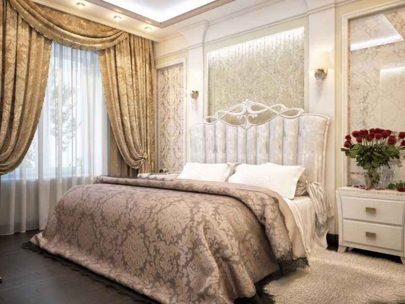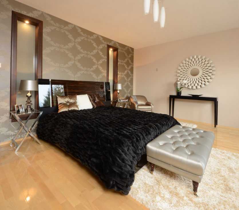 При оценке помещения необходимо учитывать его специфику, к примеру, наличие ниши, выступов, входа в балкон и т. д. Для большой спальни подходят фактурные обои, темные тона мебели, массовые люстры и разнообразие декоративных элементов.