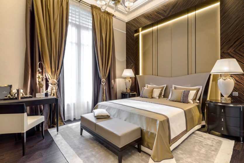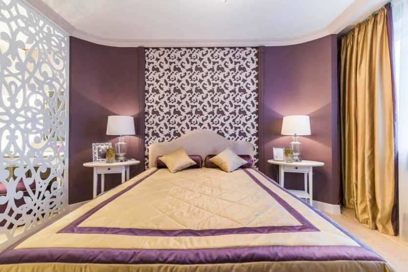 Просторная спальня выглядит роскошно, если для дизайна использованы бордовый, синий и золотистые цвета. Советуется также сочетание светлых и темных оттенков одной цветовой гаммы.