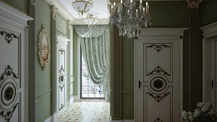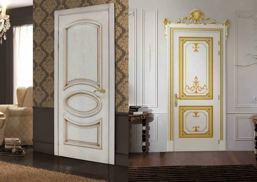 В неоклассике также используют модели дверей с эффектом состаривания. Изящность создается с помощью рукояток интересной формы. Сама дверная коробка может быть оформлена интересным декором, соответствующим направлению. Для такой цели часто используют желтые или золотистые оттенки.