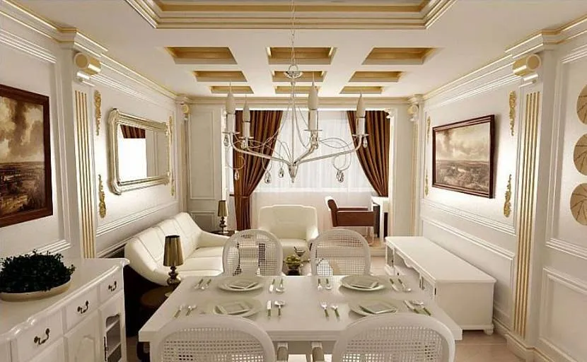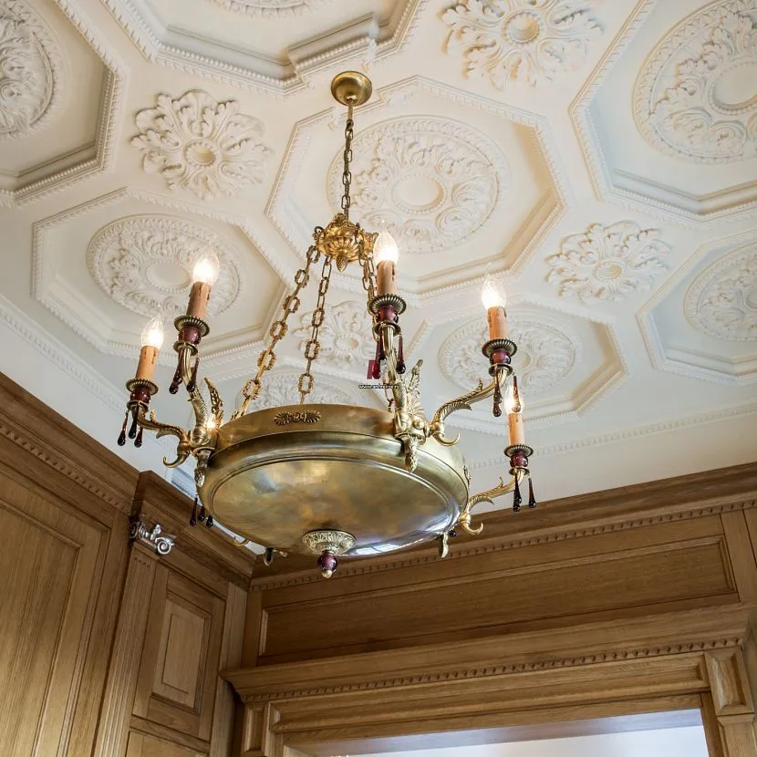 Потолок с лепниной также заслуживает внимания. Его узоры в классике и неоклассике остаются актуальными многие годы. Для такого оформления можно использовать различные орнаменты и узоры. Приветствуется чередование их в шахматном порядке на потолке.